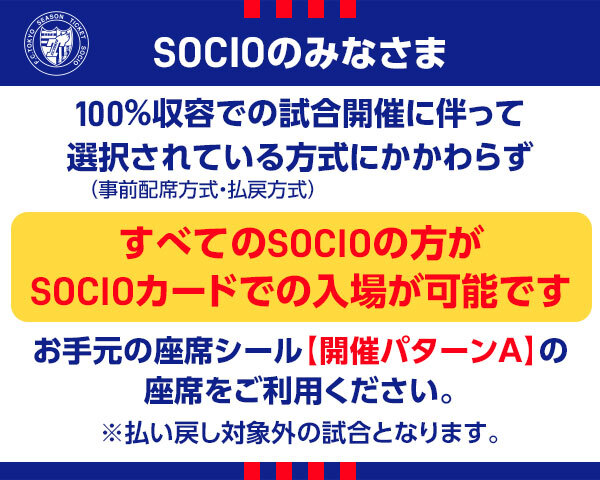 Außerdem können alle SOCIO-Mitglieder unabhängig von der gewählten Methode (Vorabplatzierung oder Rückerstattung) mit ihrer SOCIO-Karte zum Spiel mit 100 % Kapazität Zutritt erhalten.
