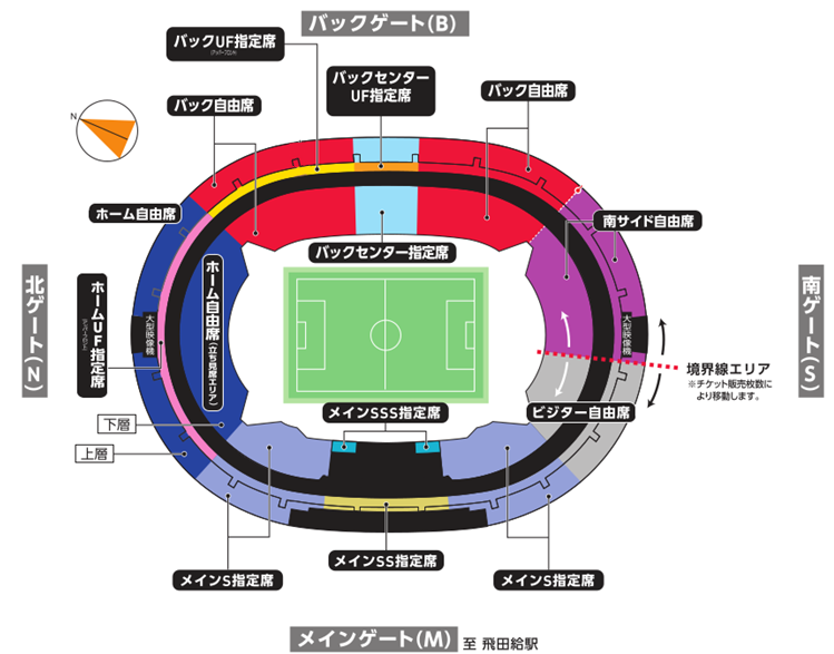 ※ Die Sitzplatzarten, bei denen das Tragen von Trikots und Fanartikeln des Gastteams sowie das Anfeuern des Gastteams erlaubt sind, sind die oben genannten „Haupttribüne SS Sitzplätze Südseite“, „Haupttribüne S Sitzplätze Südseite“ und „Besucher-Stehplätze“. Alle anderen Sitzplatzarten sind Unterstützerbereiche von FC Tokyo.
