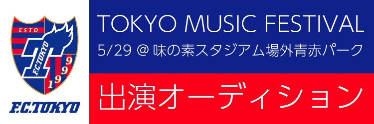 Im Rahmen des „TOKYO MUSIC FESTIVAL“, das am So., 29.05.2022 im Meiji Yasuda J1 League Spiel der 16. Runde gegen die Kashima Antlers stattfindet, wird vor dem Anpfiff eine Audition für einen Auftritt auf der eigens im AO-AKA PARK eingerichteten Bühne veranstaltet.