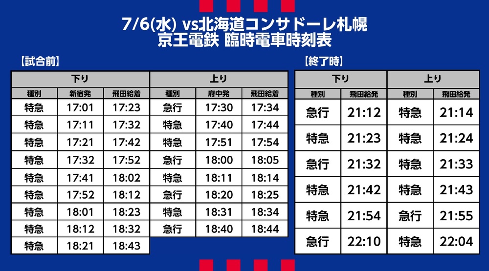 Mi., 06.07.2022 Meiji Yasuda J1 League, 20. Spieltag vs Hokkaido Consadole Sapporo (Anpfiff 19:00 / Ajinomoto Stadium) – Informationen zu den eingesetzten Sonderverkehrsmitteln (Bahn), Shuttlebus- und Linienbusverbindungen.