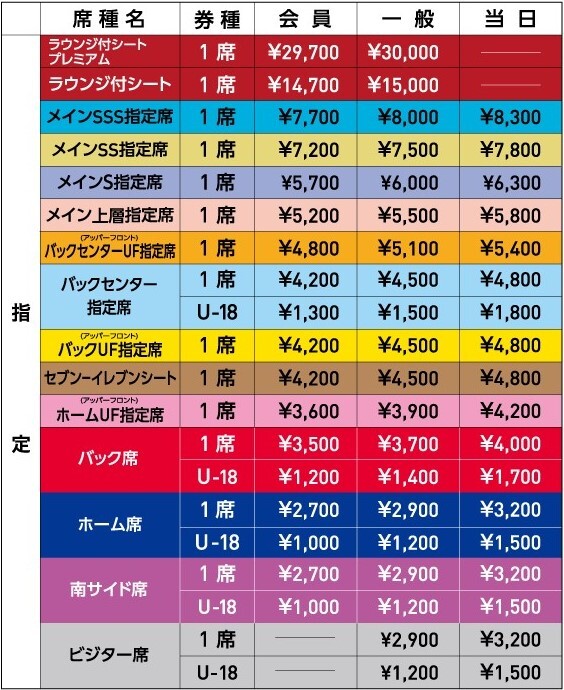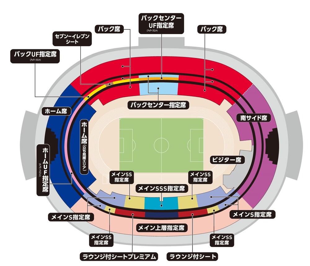 ※ Die Sitzplatzarten, bei denen das Tragen von Trikots und Fanartikeln des Besucherteams sowie das Unterstützen des Besucherteams erlaubt sind, sind die oben genannten „Haupt-SS-Reservierte Plätze Südseite“, „Haupt-S-Reservierte Plätze Südseite“ und „Besucherplätze“. Alle anderen Sitzplatzarten sind Unterstützerplätze von FC Tokyo.