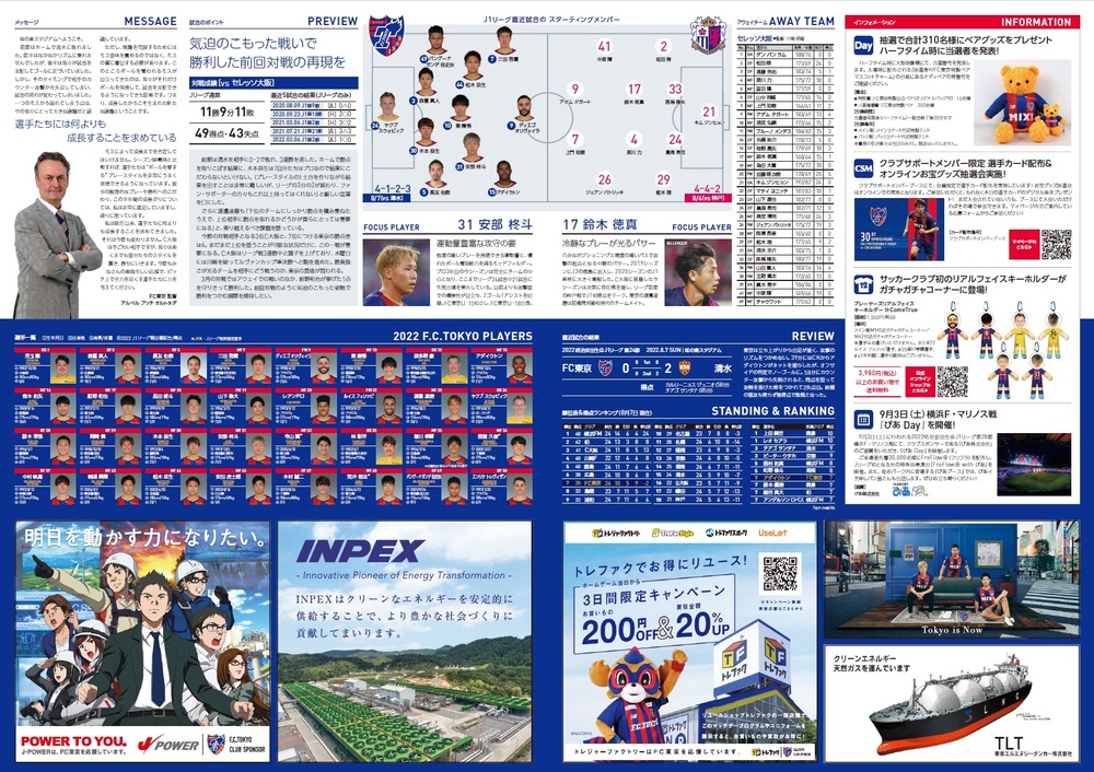 ※Die Informationen im offiziellen Matchday-Programm für das Spiel gegen Cerezo Osaka entsprechen dem Stand zum Zeitpunkt des Drucks. Aufgrund des Taifuns Nr. 8 gibt es einige Änderungen, z. B. bei den Informationen zum AO-AKA PARK. Wir bitten um Ihr Verständnis.