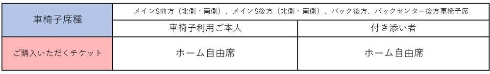 ※Die Rollstuhlsitzplätze, auf denen Sie mit der Uniform oder den Fanartikeln des Gastteams zuschauen können, sind nur die vorderen Rollstuhlsitzplätze im Hauptbereich S (Südseite) und die hinteren Rollstuhlsitzplätze im Hauptbereich S (Südseite).