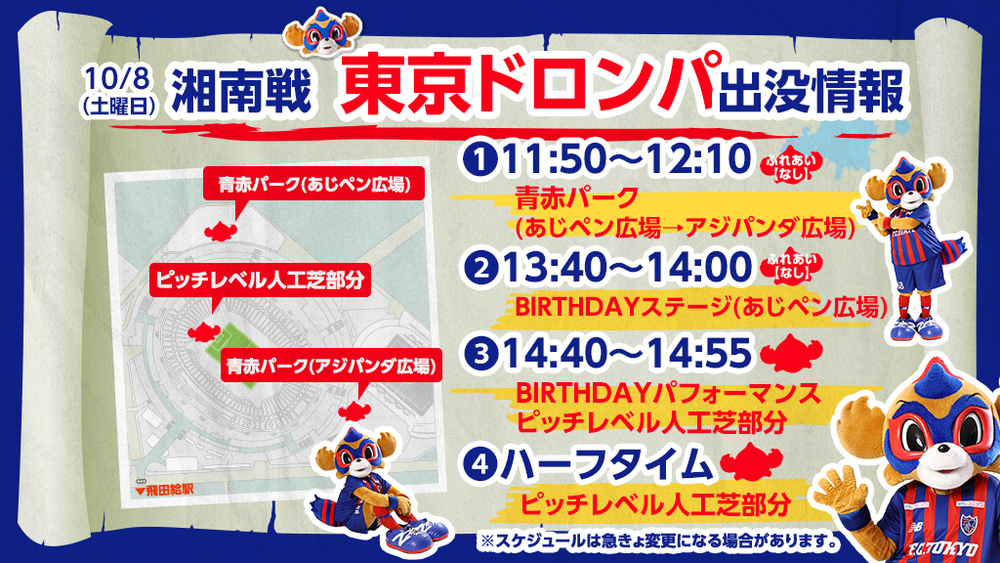 Sa., 08.10.2022 Meiji Yasuda J1 League Runde 32 vs Shonan Bellmare (Anpfiff 15:00/Ajinomoto Stadium) erscheint TOKYO DOROMPA wie unten beschrieben.