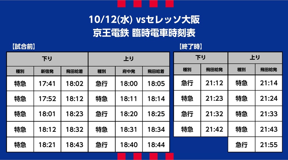 Mi., 12.10.2022 Meiji Yasuda J1 League, 25. Spieltag vs Cerezo Osaka (Anpfiff 19:00 / Ajinomoto Stadium) Informationen zum Sonderverkehr (Bahn), Shuttlebus- und Linienbusbetrieb an diesem Tag.