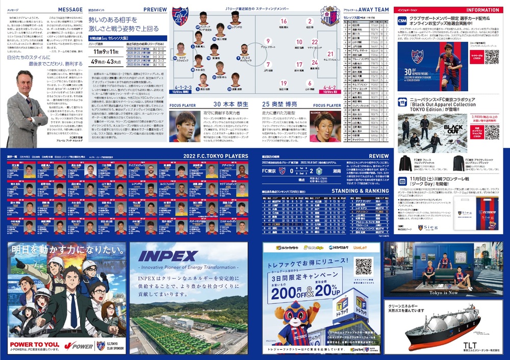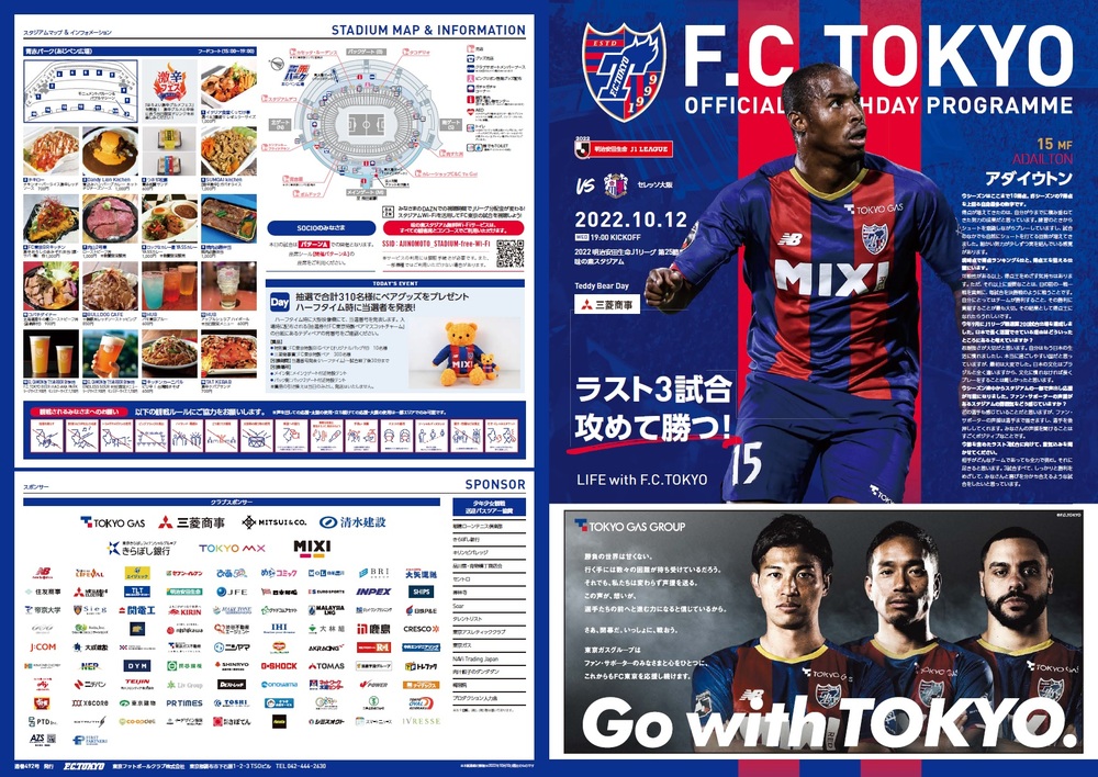 Mi., 12.10.2022 Meiji Yasuda J1 League, 25. Spieltag vs Cerezo Osaka (Anstoß 19:00 / Ajinomoto Stadium) Offizielles Matchday-Programm, Informationen wie folgt.