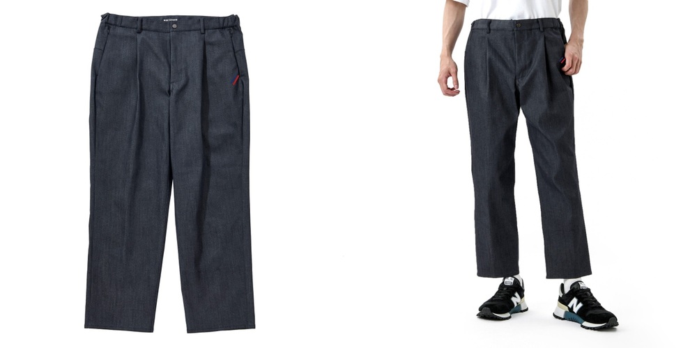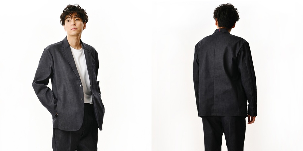 Das größte Merkmal ist, dass die Farbe nicht ausbleicht. Außerdem verfügt es über Stretch-Eigenschaften und eine wasserabweisende Beschichtung, ist zu 100 % aus Funktionsfaser gefertigt und hat dennoch eine Farbe, die dem echten Denim sehr nahekommt, sowie eine natürliche Vintage-Optik von Baumwolle. Der Kragen ist mit blau-roter Stickerei versehen. Es kann als Set mit der gleichnamigen Jeanshose mit schöner Silhouette getragen werden.