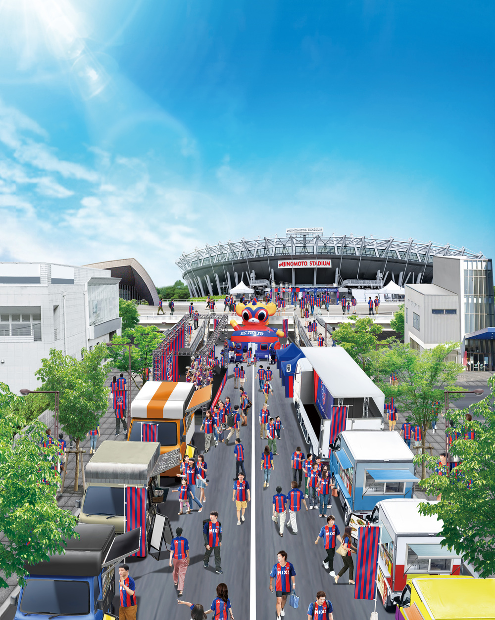 Die "Stadionstraße" von Tobitakyu Station bis zum Ajinomoto Stadium wird zur Fußgängerzone erklärt, mit Food-Trucks, einer Bühne, einem Stand der Stadt Chofu sowie einer Tokyo Dorompa Hüpfburg und weiteren Attraktionen ausgestattet.