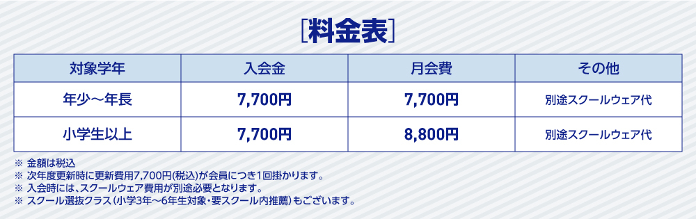 ・Wenn Sie sich für mehrere Schulen (Veranstaltungsorte) oder Kurse (Wochentage) anmelden möchten, ist für jede Schule und jeden Kurs eine separate Anmeldung erforderlich. In diesem Fall fällt die Aufnahmegebühr bei der Anmeldung zu einer der Schulen an, und die monatlichen Gebühren gelten für jeden Kurs, bei dem Sie sich anmelden.