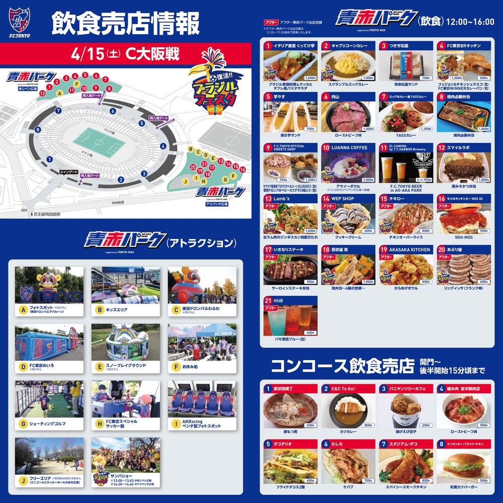 Am Sa., 15.04., beim Spiel gegen Cerezo Osaka werden die Speisen im AO-AKA PARK supported by TOKYO GAS (außerhalb des Stadions) sowie an den Konzessionsständen im Stadioninnenraum (Innenbereich) verkauft.