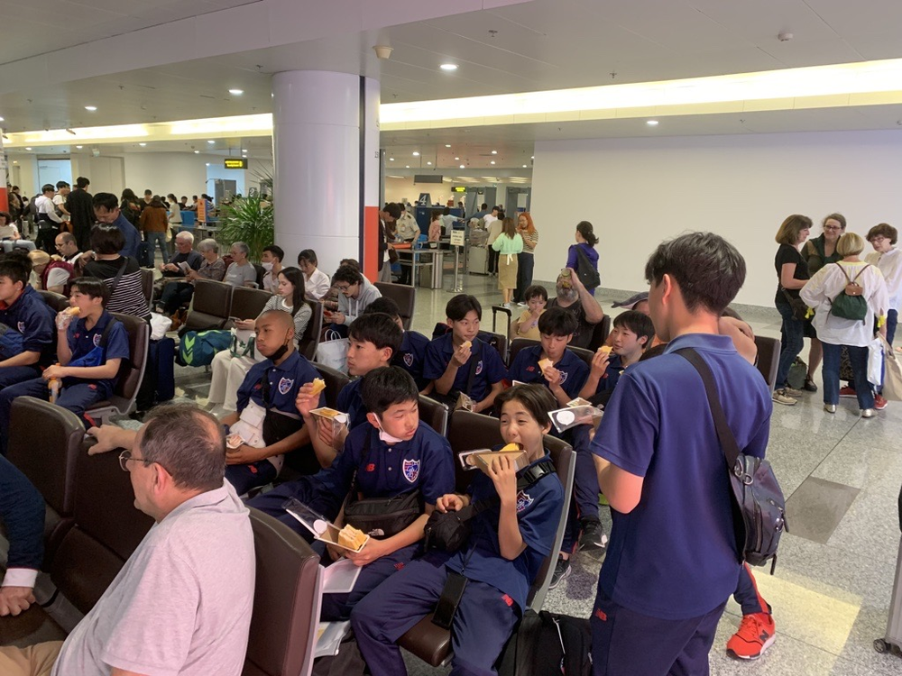 Da Auslandsreisen aufgrund der Auswirkungen der COVID-19-Pandemie lange nicht möglich waren, sind die Gesichtsausdrücke der Spieler vielfältig, da diese Reise nun endlich wieder aufgenommen wird.