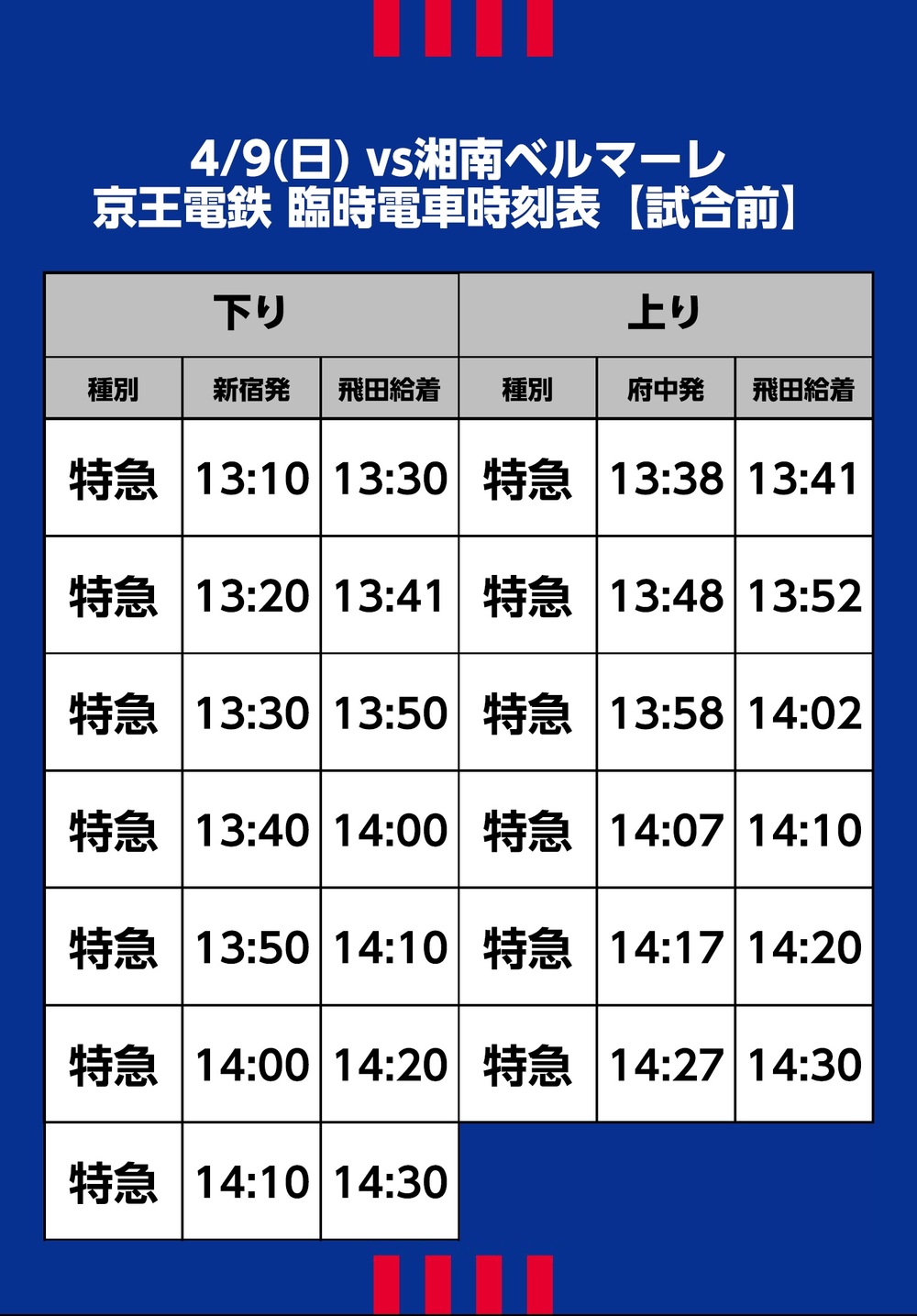 Am So., 09.04.2023, Meiji Yasuda J1 League, 7. Spieltag, gegen Shonan Bellmare (Anpfiff 15:00 / Ajinomoto Stadium). Hier finden Sie Informationen zu den Sonderverkehrsmitteln (Bahn), Shuttlebus- und Linienbusverbindungen, die an diesem Tag verkehren.