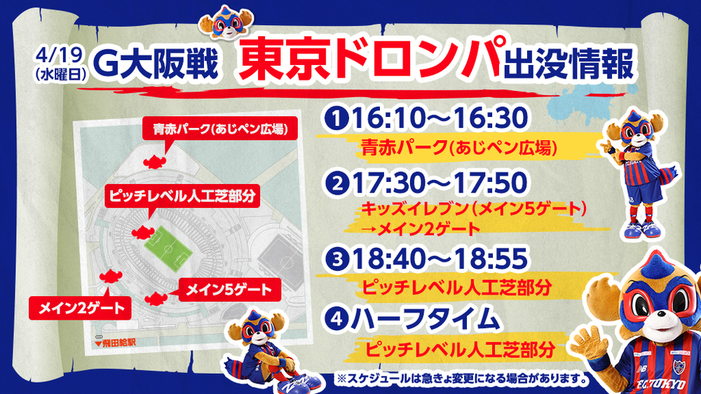 Mi., 19.04.2023 J-League YBC Levain Cup Gruppenphase 4. Spieltag vs Gamba Osaka (Anpfiff 19:00 / Ajinomoto Stadium) wird TOKYO DOROMPA wie folgt erscheinen.