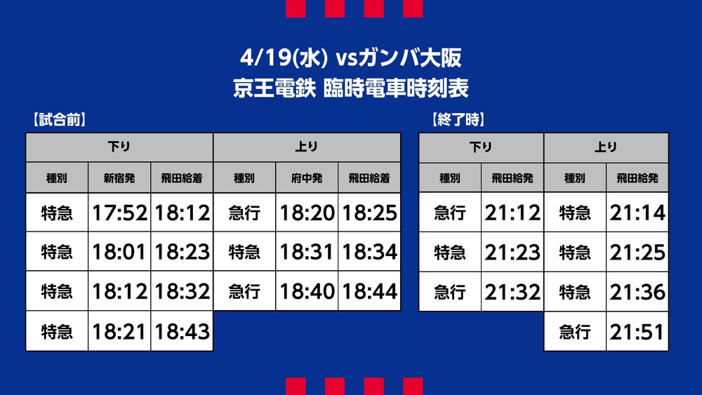 Mi., 19.04.2023 J-League YBC Levain Cup 4. Spieltag vs Gamba Osaka (Anpfiff 19:00 / Ajinomoto Stadium) – Informationen zu den eingesetzten Sonderverkehrsmitteln (Bahn), Shuttlebus- und Linienbusverbindungen.