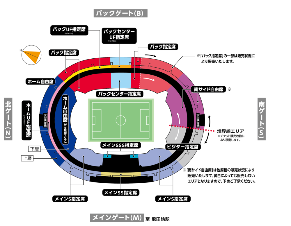 ※ Die Sitzplatzarten, bei denen das Tragen von Trikots und Fanartikeln des Auswärtsteams sowie das Anfeuern des Auswärtsteams erlaubt sind, sind die oben genannten drei Sitzplatzarten „Haupttribüne SS Sitzplätze Südseite“, „Haupttribüne S Sitzplätze Südseite“ und „Besuchersitzplätze“. Alle anderen Sitzplatzarten sind Unterstützerbereiche von FC Tokyo.