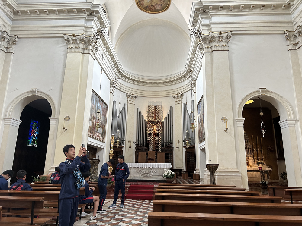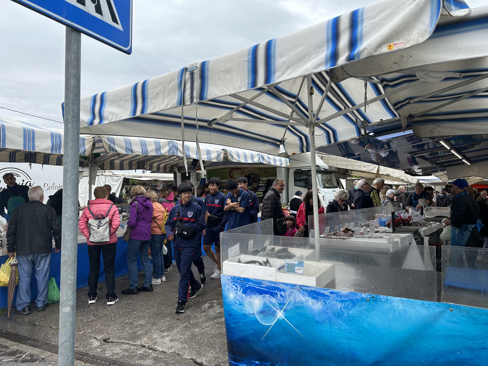 Am 4. Tag der Reise, dem 17. (Mi), begann der Tag wieder mit einem Morgenspaziergang und Gymnastik. Nach dem Frühstück machten wir eine kurze Pause und gingen dann auf einen längeren Spaziergang, um uns auf das Spiel mit Anpfiff um 17:00 vorzubereiten. Dabei besuchten wir eine Kirche und einen Markt und genossen die italienische Kultur mit allen Sinnen.