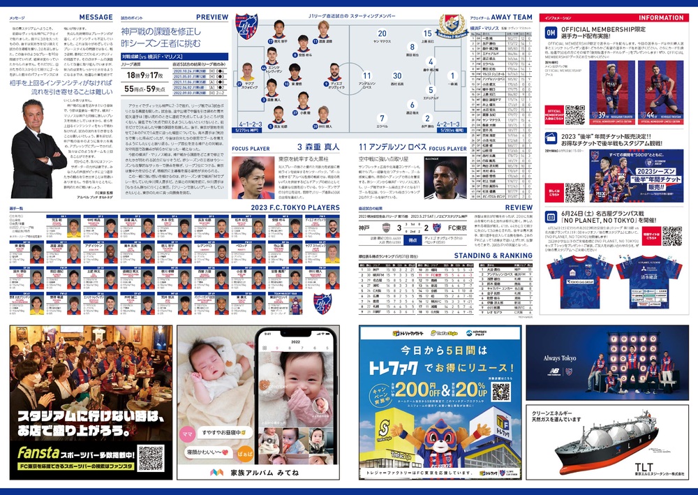 Am Sa., 03.06.2023, offizielles Matchday-Programm zum 16. Spieltag der Meiji Yasuda J1 League gegen Yokohama F.Marinos (Anpfiff 15:00 / Ajinomoto Stadium), wie unten beschrieben.