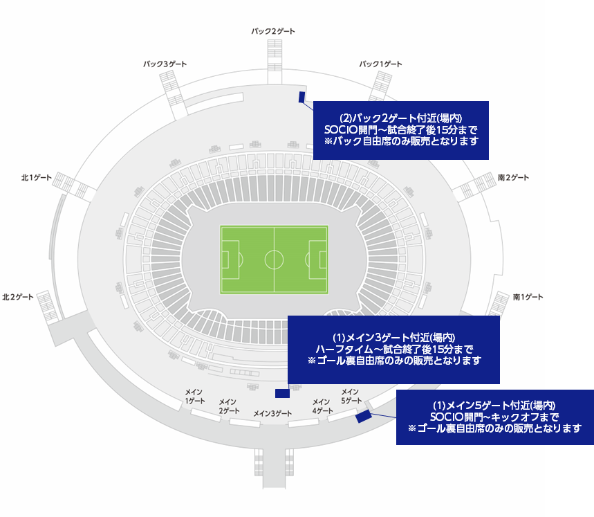 ※ Von der SOCIO-Öffnung bis zum Anpfiff. Nach der Halbzeitpause wird der Verkaufsstand in die Nähe des Haupttors 3 verlegt.