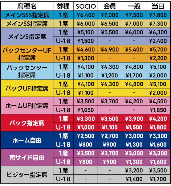 ※ Die Sitzplatzarten, bei denen das Tragen von Trikots und Fanartikeln des Auswärtsteams sowie das Anfeuern des Auswärtsteams erlaubt sind, sind die oben genannten drei Sitzplatzarten „Haupttribüne SS Sitzplätze Südseite“, „Haupttribüne S Sitzplätze Südseite“ und „Besuchersitzplätze“. Alle anderen Sitzplatzarten sind Unterstützerbereiche von FC Tokyo.