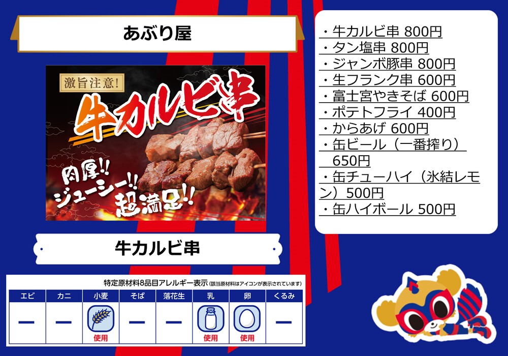 Am Sa., 23.09. (Feiertag) beim Spiel gegen Sagan Tosu werden im AO-AKA PARK supported by TOKYO GAS (außerhalb) sowie an den Verkaufsständen im Stadioninnenraum (Innenbereich) folgende Speisen angeboten.