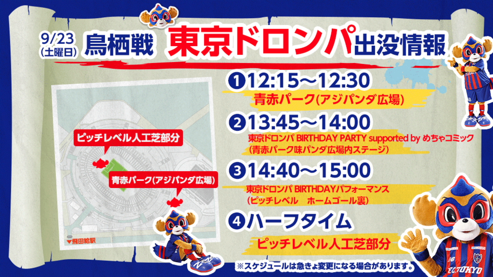 Sa., 23.09. 2023 Meiji Yasuda J1 League 28. Spieltag vs Sagan Tosu (Anstoß 15:00 / Ajinomoto Stadium) wird TOKYO DOROMPA wie folgt erscheinen.