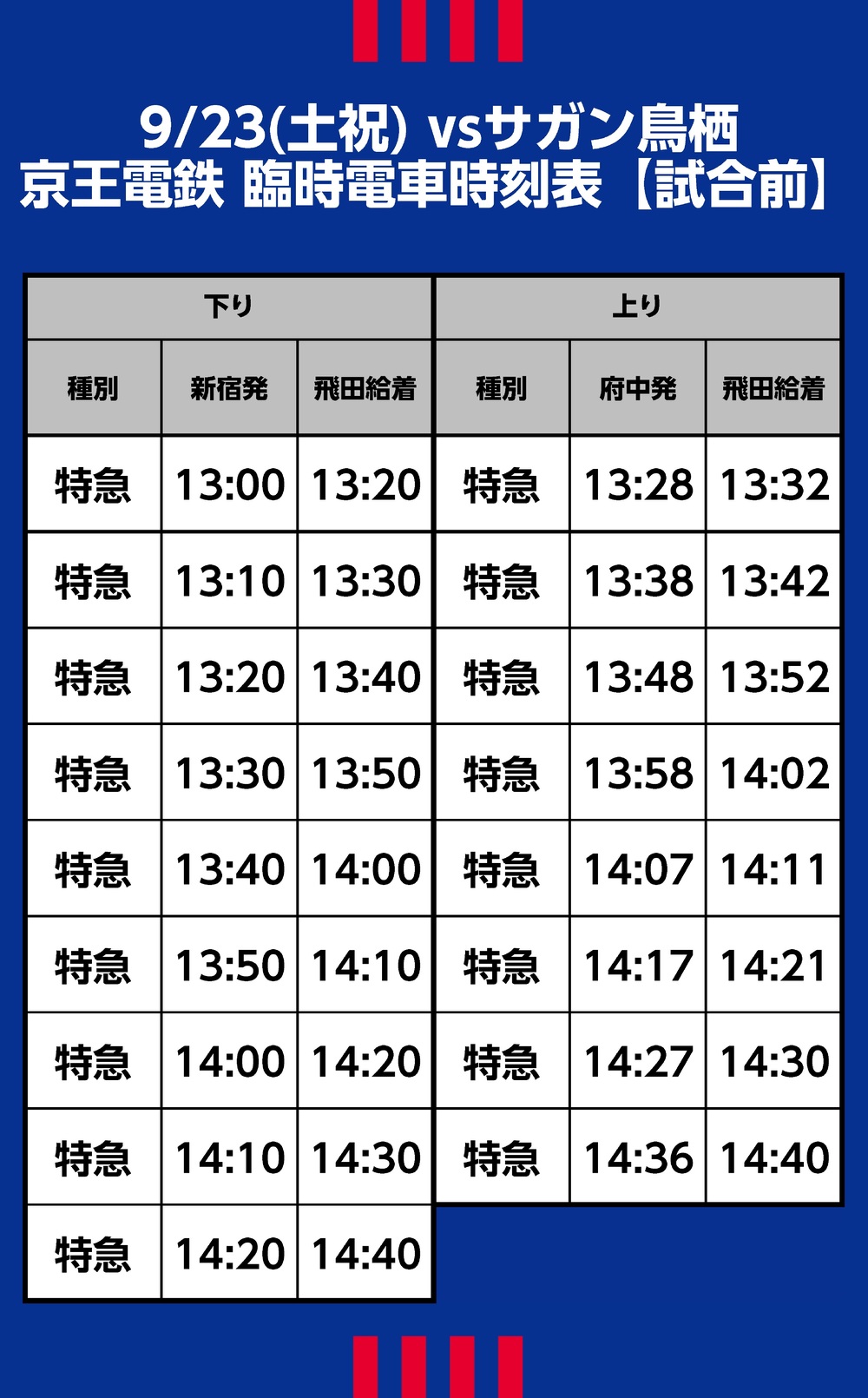 Sa., 23.09.2023 Meiji Yasuda J1 League 28. Spieltag vs Sagan Tosu (Anpfiff 15:00 / Ajinomoto Stadium) Informationen zu den eingesetzten Sonderverkehrsmitteln (Bahn), Shuttlebus- und Linienbusverbindungen.