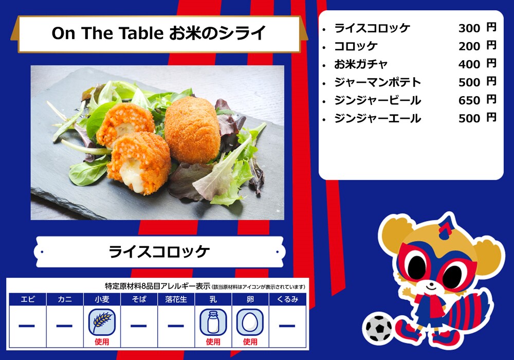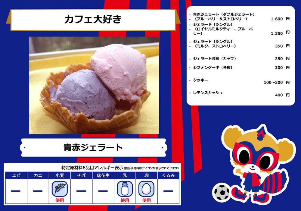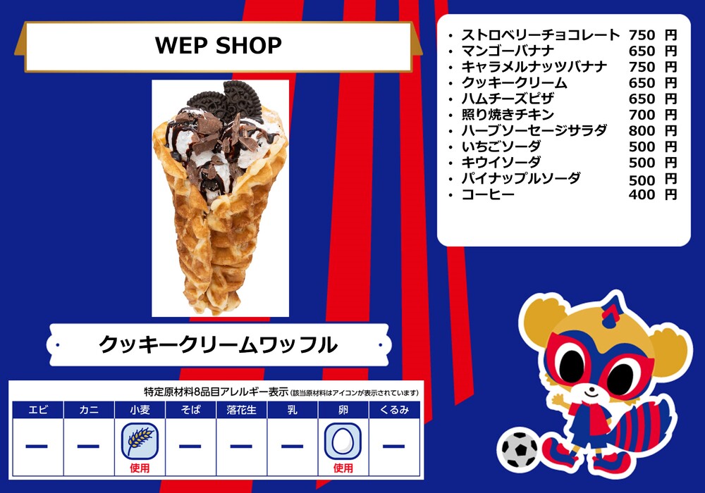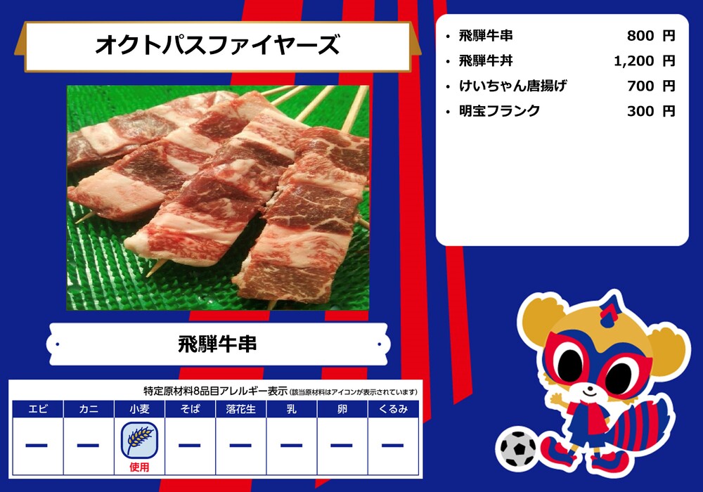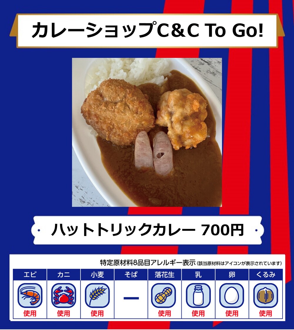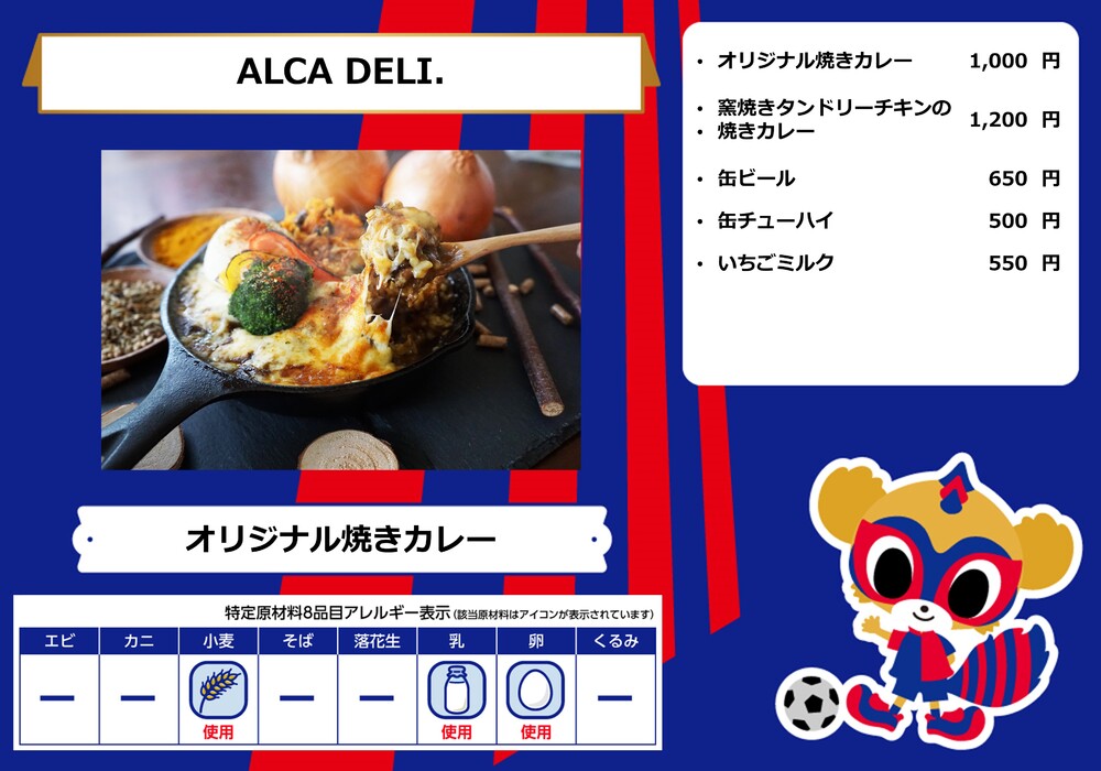 Dies ist das Speisenangebot, das am Samstag, den 28.10., beim Spiel gegen Sanfrecce Hiroshima in der AO-AKA STREET und im AO-AKA PARK supported by TOKYO GAS (außerhalb des Stadions) sowie an den Verkaufsständen im Innenbereich des Stadions erhältlich sein wird.