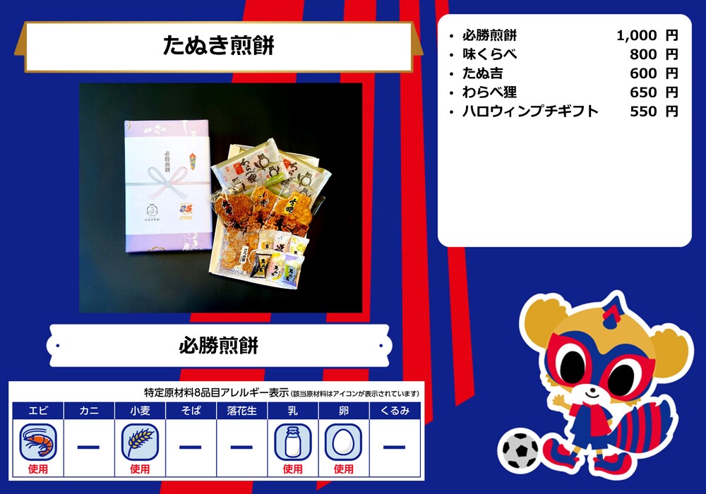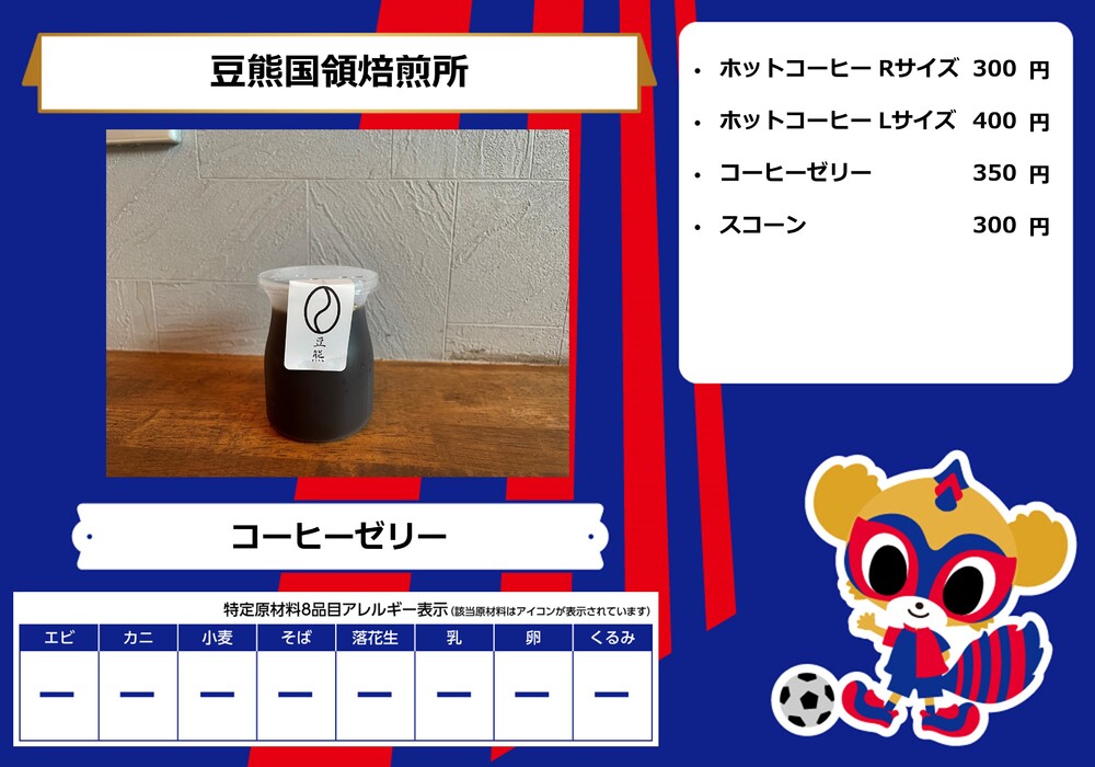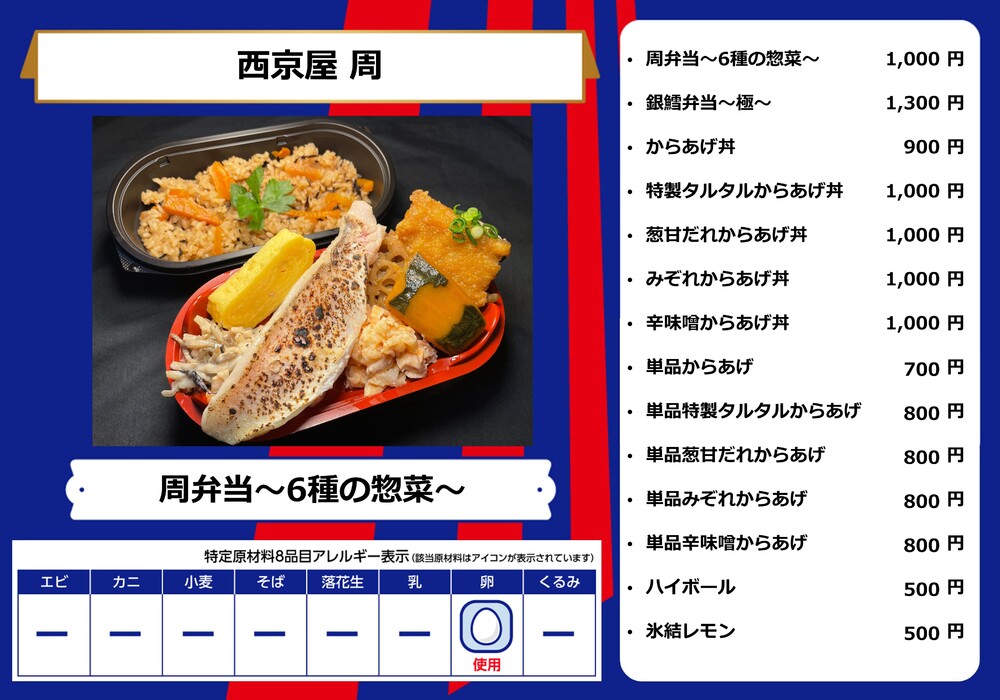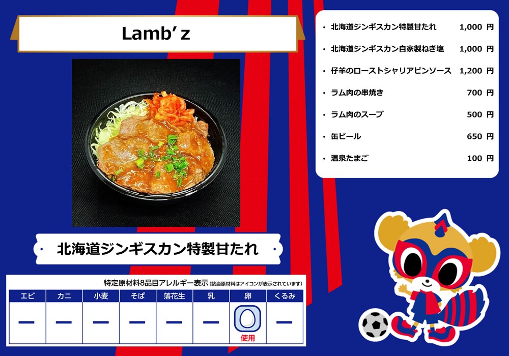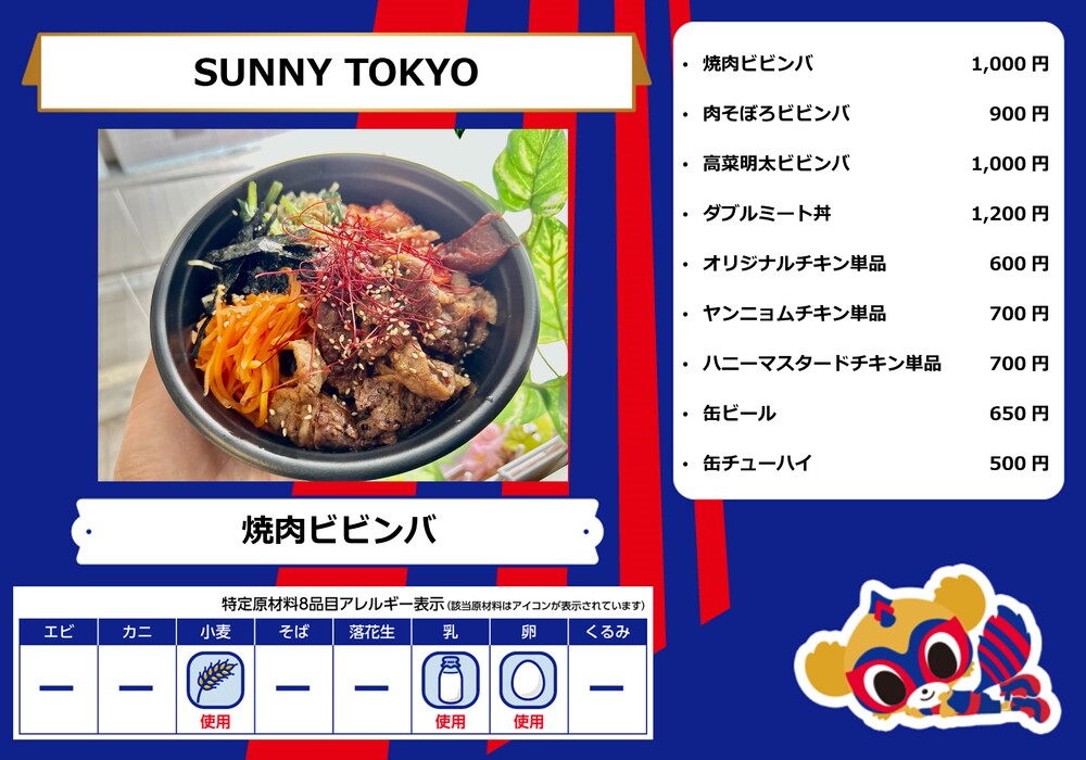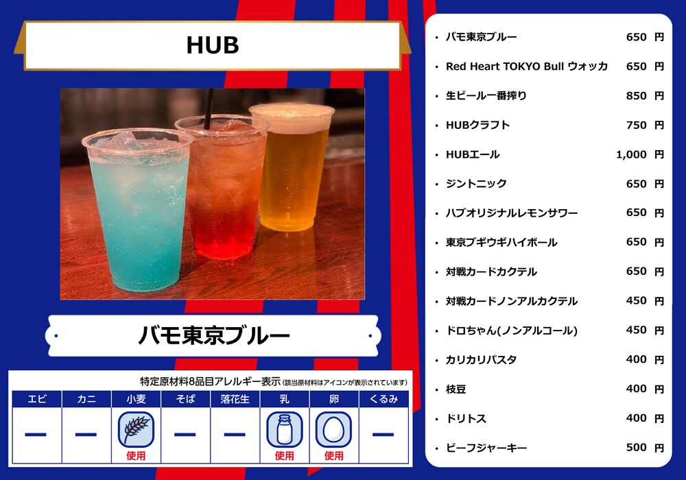 Dies ist das Speisenangebot, das am Samstag, den 28.10., beim Spiel gegen Sanfrecce Hiroshima in der AO-AKA STREET und im AO-AKA PARK supported by TOKYO GAS (außerhalb des Stadions) sowie an den Verkaufsständen im Innenbereich des Stadions erhältlich sein wird.