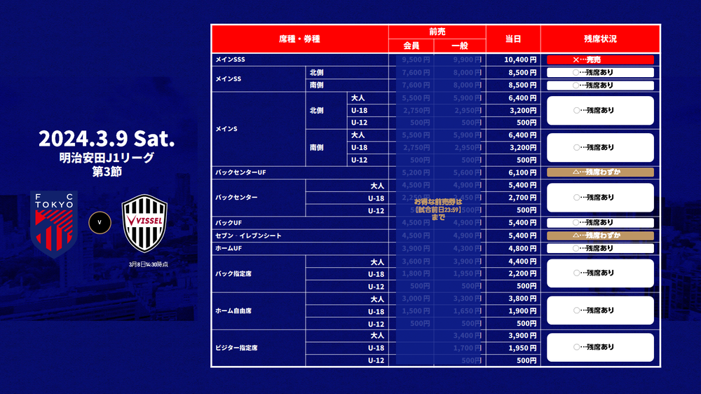 Zum Verkauf von Tageskarten für das Spiel der 3. Runde der Meiji Yasuda J1 League 2024 FC Tokyo vs Vissel Kobe (Anpfiff 16:00 / Ajinomoto Stadium) informieren wir Sie wie folgt.