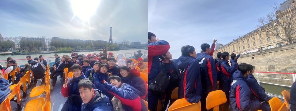 Bei der Seine-Flusskreuzfahrt fuhren wir die gleiche Wasserroute entlang, die bei der Eröffnungsfeier der Olympischen Spiele Paris 2024 für den Einmarsch der Athleten genutzt wird. Als der Eiffelturm, ein weiteres Wahrzeichen von Paris neben dem Arc de Triomphe, in Sicht kam, waren die Spieler sehr begeistert. Wir machten ein gemeinsames Erinnerungsfoto. Außerdem genossen sie durchgehend die ganz andere Stadtlandschaft im Vergleich zu Japan.