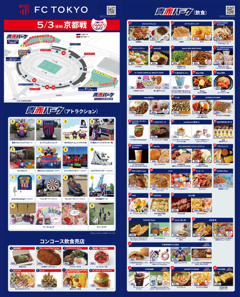 Wir informieren Sie über die Verpflegungsangebote, die am 03.05. (Feiertag) beim Spiel gegen Kyoto Sanga F.C. im AO-AKA PARK (außerhalb des Stadions), beim Außeneinsatz des AO-AKA PARK sowie an den Verkaufsständen im Stadioninnenbereich (im Stadion) erhältlich sind.