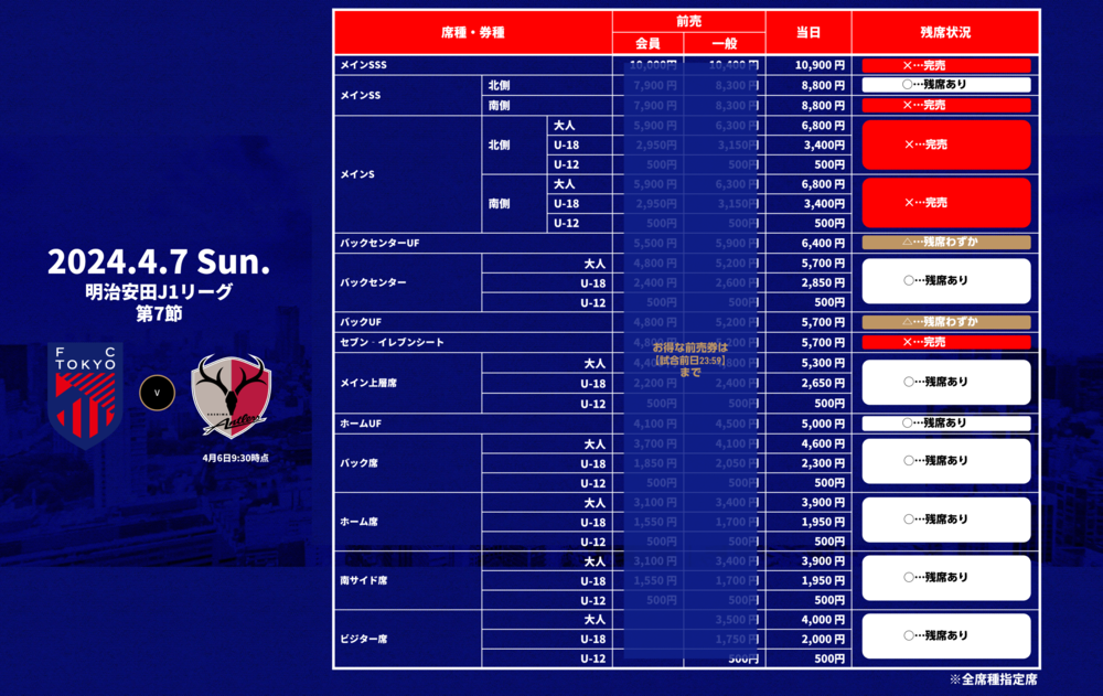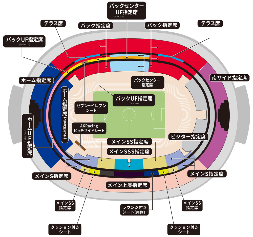 ※ Die Sitzplatzarten, bei denen das Tragen von Trikots und Fanartikeln der Gastmannschaft sowie das Anfeuern der Gastmannschaft erlaubt sind, sind die oben genannten „Haupttribüne SS reservierter Sitzplatz Südseite“, „Haupttribüne S reservierter Sitzplatz Südseite“ und „Besucher-Sitzplatz“. Alle anderen Sitzplatzarten sind Unterstützerbereiche von FC Tokyo.