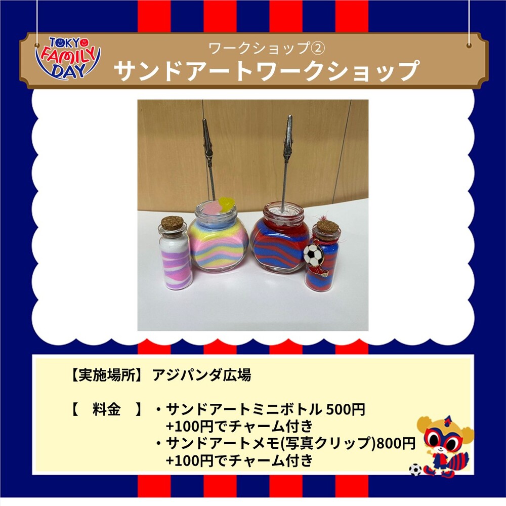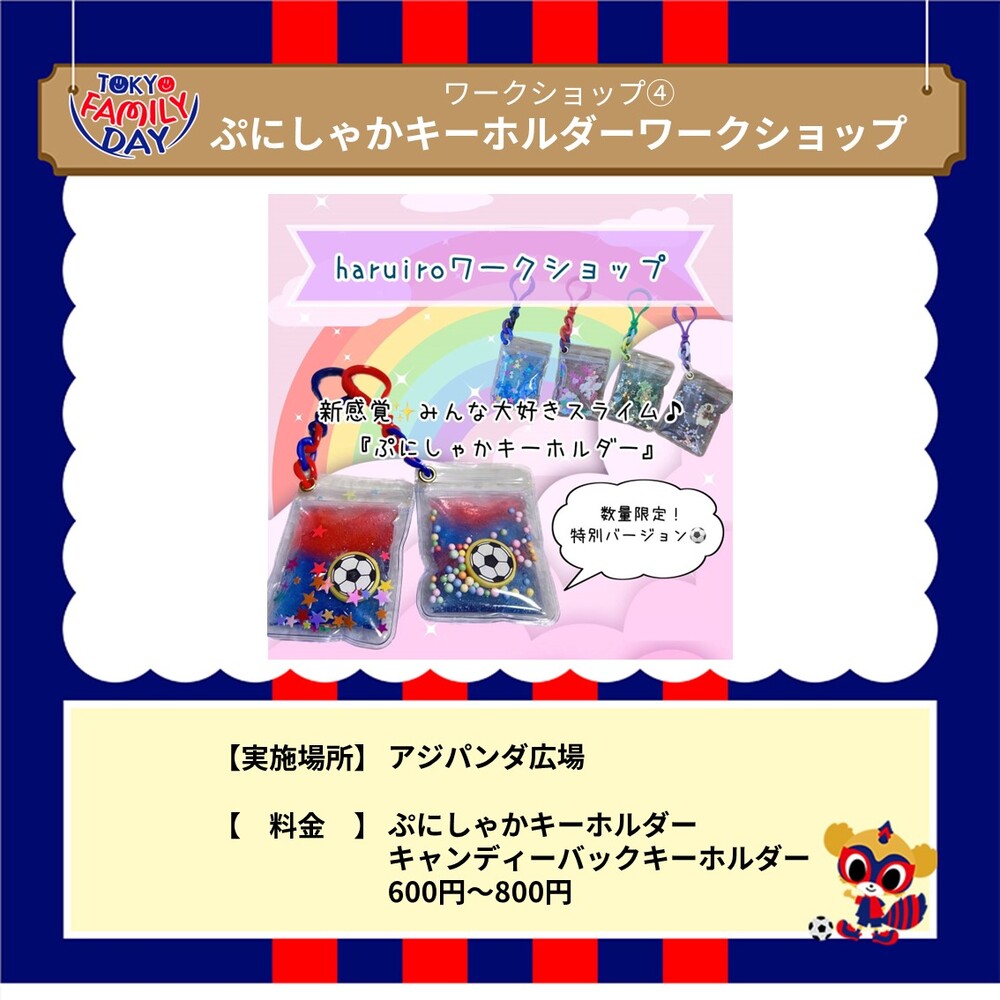 Es erwarten Sie 6 verschiedene Attraktionen, darunter eine neue Attraktion, die exklusiv bei den Heimspielen von FC Tokyo vorgestellt wird! Außerdem findet ein Workshop statt, bei dem Sie niedliche Brillen und Schlüsselanhänger herstellen können!