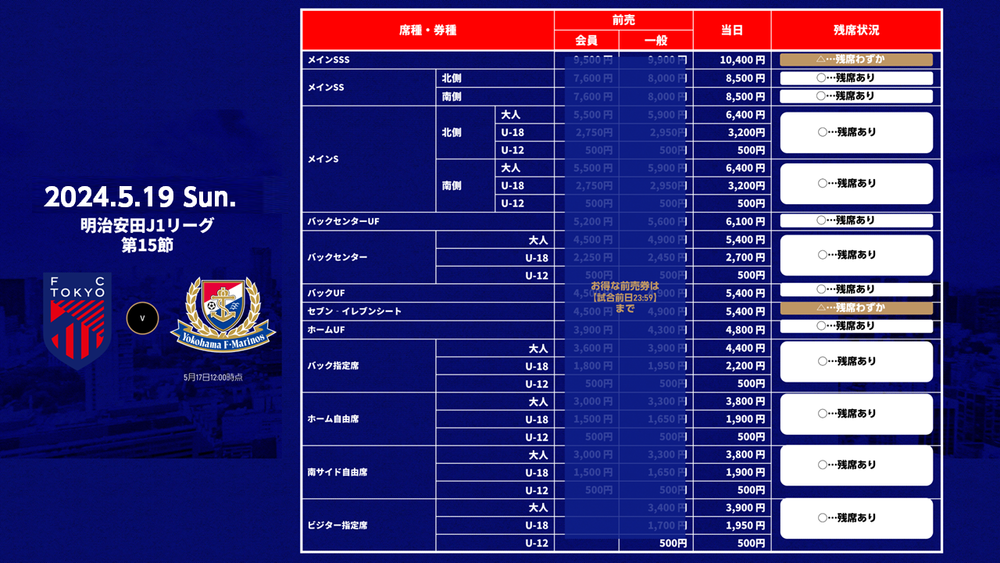 Zum Verkauf von Tageskarten für das Spiel der 15. Runde der Meiji Yasuda J1 League 2024 FC Tokyo vs Yokohama F.Marinos (Anpfiff 15:00 / Ajinomoto Stadium) informieren wir Sie wie folgt.
