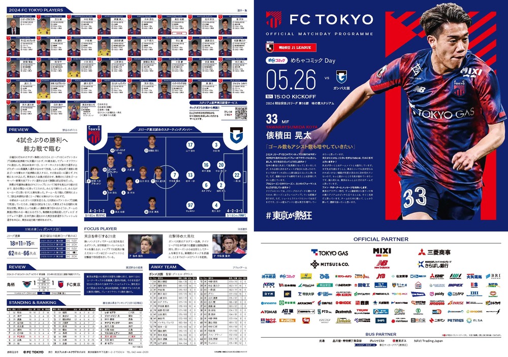 So., 26.05.2024 Offizielles Matchday-Programm zum 16. Spieltag der Meiji Yasuda J1 League gegen Gamba Osaka (Anpfiff 15:00 / Ajinomoto Stadium), Informationen wie folgt.