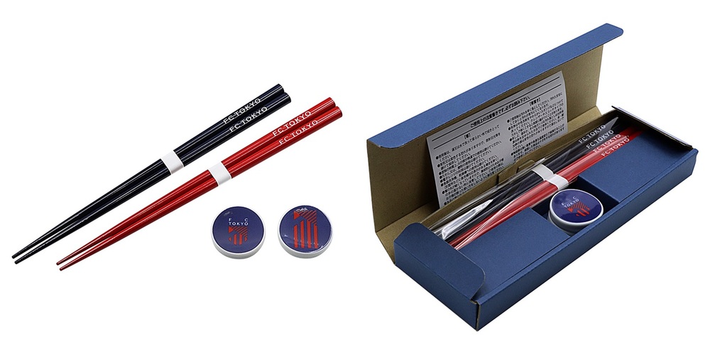 Die Essstäbchenhalter sind in zwei Emblem-Designs erhältlich, die Essstäbchen gibt es in zwei Farben: Marineblau und Rot.
