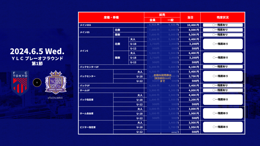 ※ Am Spieltag werden keine Tageskarten am Veranstaltungsort verkauft. Der Verkauf erfolgt ausschließlich über Ticket FC Tokyo (J-League Ticket).