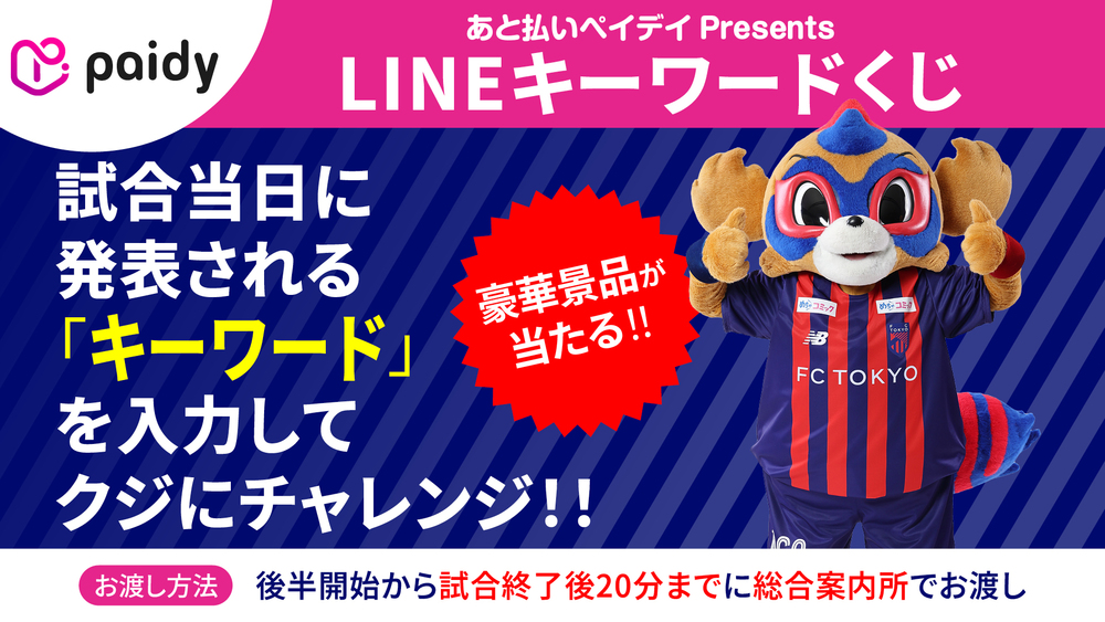 Ab dem 30.06.2024 (So) im Spiel der 21. Runde der Meiji Yasuda J1 League gegen Avispa Fukuoka (Anpfiff 18:30 / Ajinomoto Stadium) veranstalten wir mit freundlicher Unterstützung von Paidy, Inc. die Aktion „Nachträgliche Bezahlung Paidy presents LINE Schlüsselwort-Lotterie“.