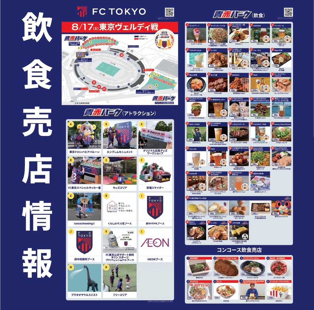 Am Sa., 17.08., beim Spiel gegen Tokyo Verdy informieren wir Sie über die Speise- und Getränkestände im AO-AKA PARK (außerhalb des Stadions), im mobilen AO-AKA PARK sowie an den Verkaufsständen im Innenbereich des Stadions (im Innenraum).