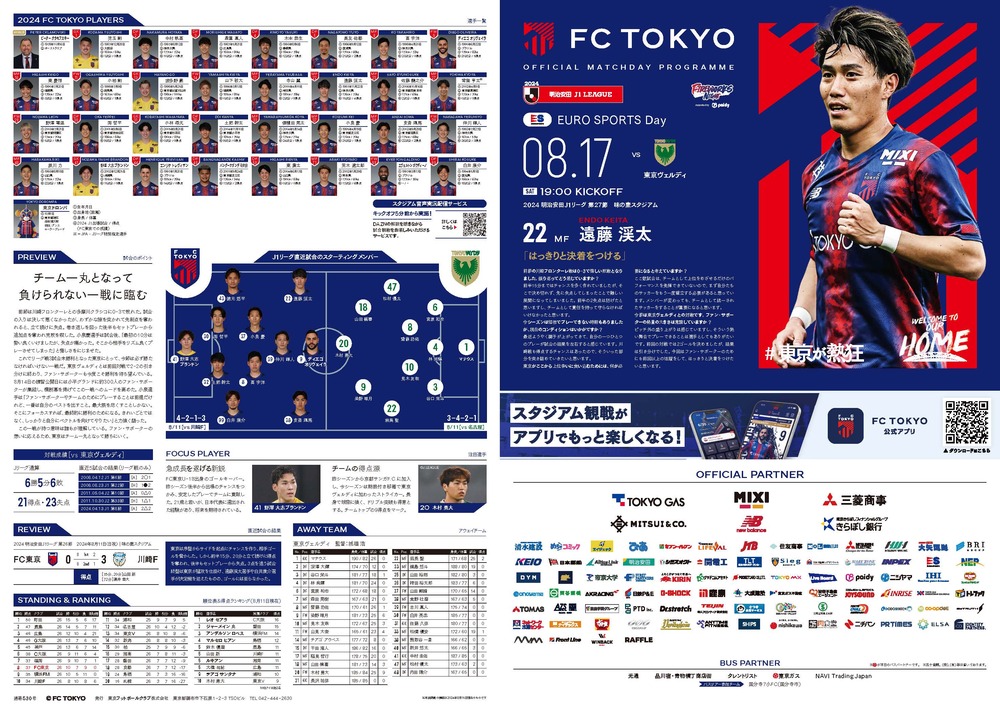Sa., 17.08.2024 Offizielles Matchday-Programm zur 27. Runde der Meiji Yasuda J1 League gegen Tokyo Verdy (Anpfiff 19:00 / Ajinomoto Stadium), Informationen wie folgt.