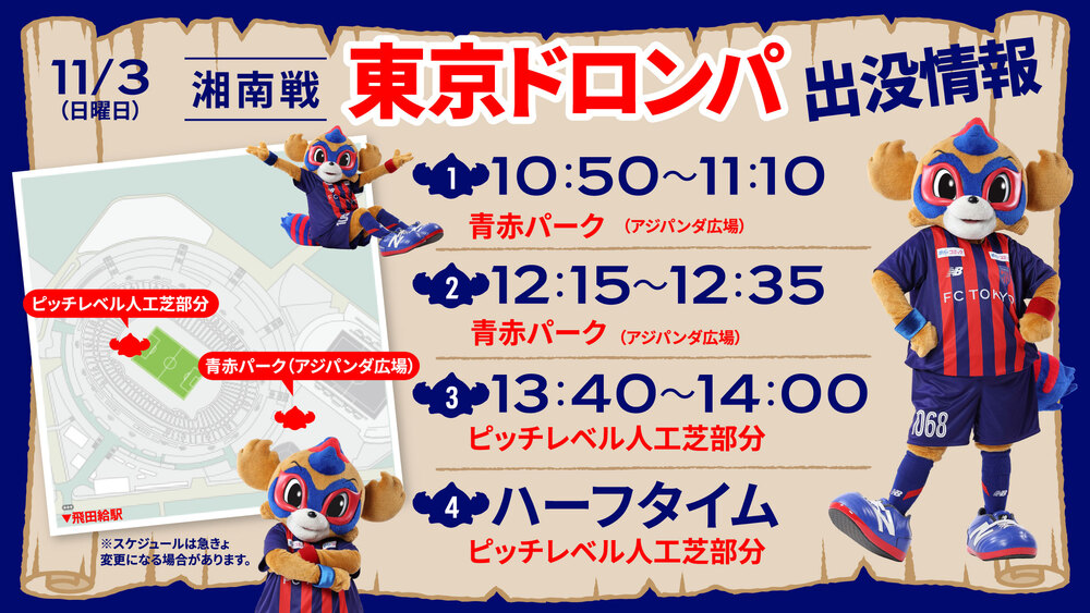 So., 03.11. (Feiertag) 2024 Meiji Yasuda J1 League 35. Spieltag vs Shonan Bellmare (Anpfiff 14:00 / Ajinomoto Stadium) wird TOKYO DOROMPA wie folgt erscheinen.