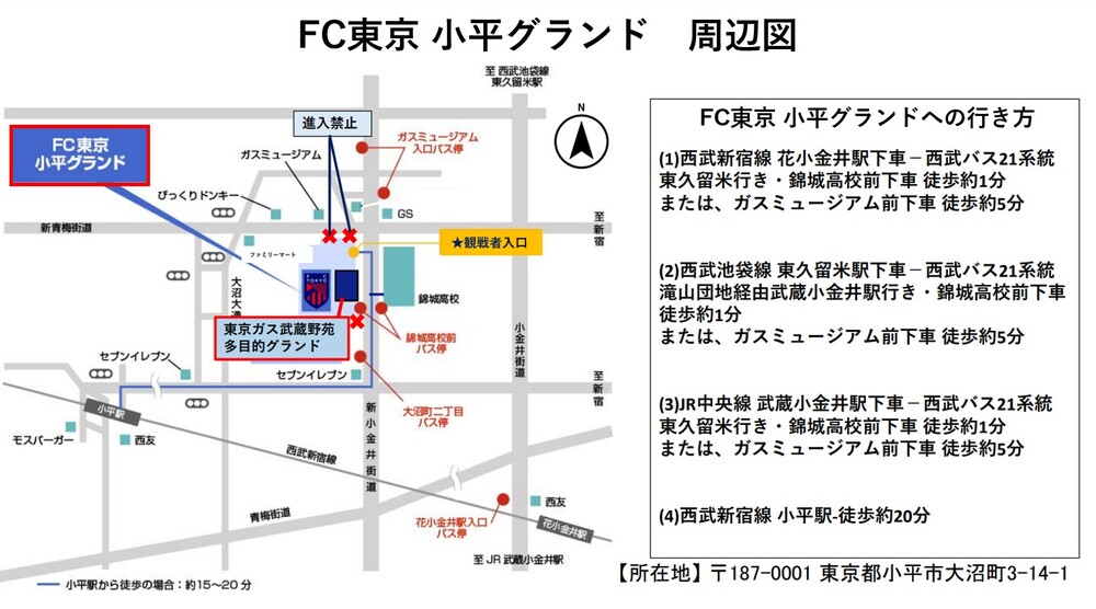Aussteigen an der Seibu-Ikebukuro-Linie „Higashikurume Station“, Seibu-Bus (Linie 21 Richtung Musashi-Koganei Station) aussteigen an „Kinjo High School“, 1 Minute zu Fuß