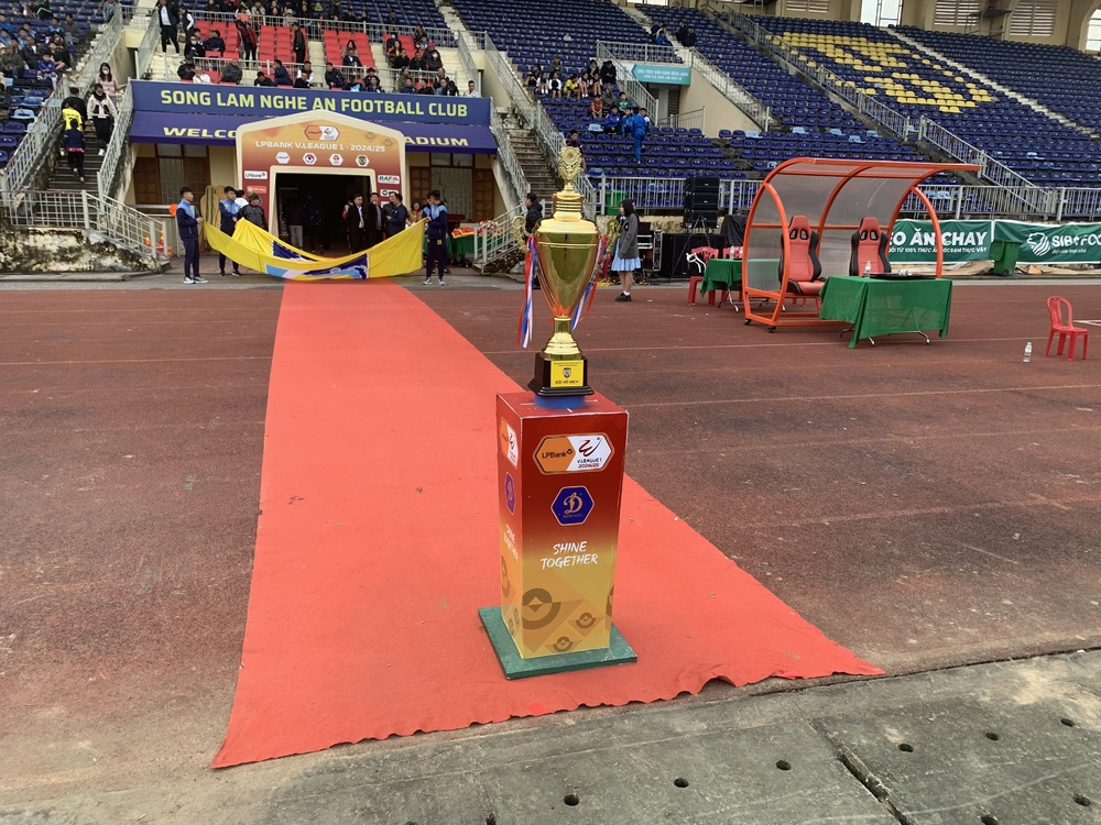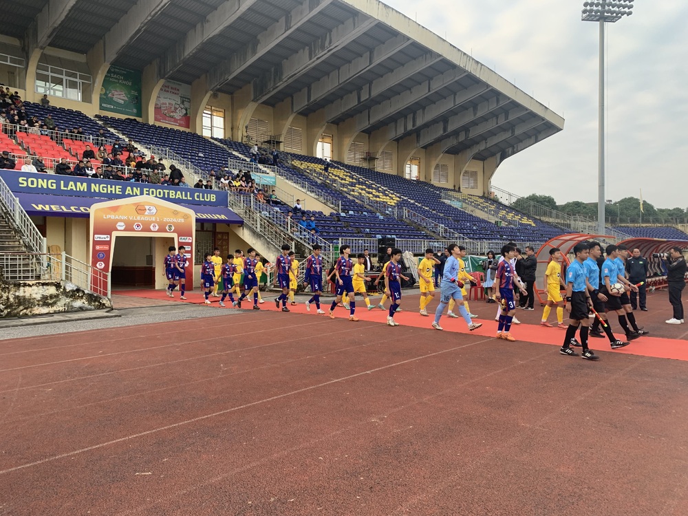 In der ersten Runde trafen wir auf Son Lam Nghe An B. Die Zeremonie vor dem Spiel, einschließlich des Einzugs der Spieler, der Blumenübergabe und der Nationalhymne, fand in einer sehr feierlichen Atmosphäre statt.