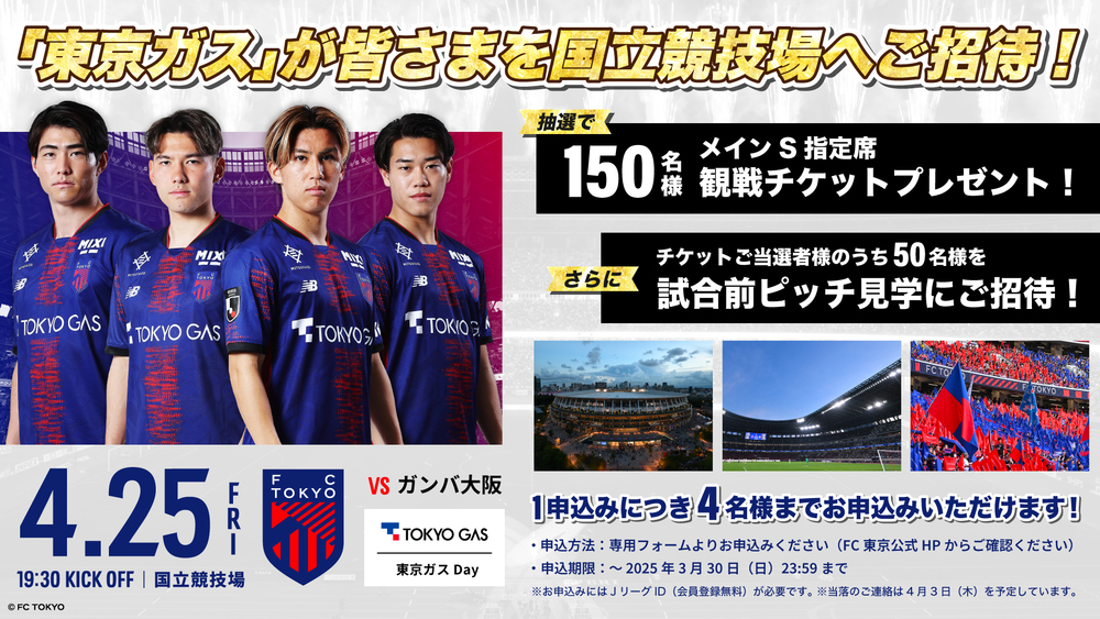 Am Fr., 25.04.2025, im 12. Spieltag der Meiji Yasuda J1 League gegen Gamba Osaka (Anpfiff 19:30 / Japan National Stadium) veranstalten wir mit Unterstützung unseres offiziellen Clubpartners TOKYO GAS CO.,LTD den „Tokyo Gas Day“.
