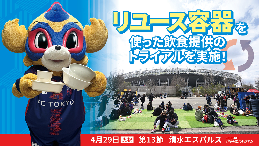 Sa., 29.04. (Feiertag) 2025 Meiji Yasuda J1 League 13. Spieltag vs Shimizu S-Pulse (Anpfiff 13:05/Ajinomoto Stadium) wird im Rahmen einer Aufklärungskampagne in Zusammenarbeit mit „HEROs PLEDGE“, die darauf abzielt, Einwegplastikmüll im Sportbereich zu eliminieren, ein Versuch durchgeführt, bei dem ein Teil der im AO-AKA PARK supported by JOYPOLIS angebotenen Speisen und Getränke in Mehrwegbehältern ausgegeben wird, um die Wirksamkeit zu überprüfen.