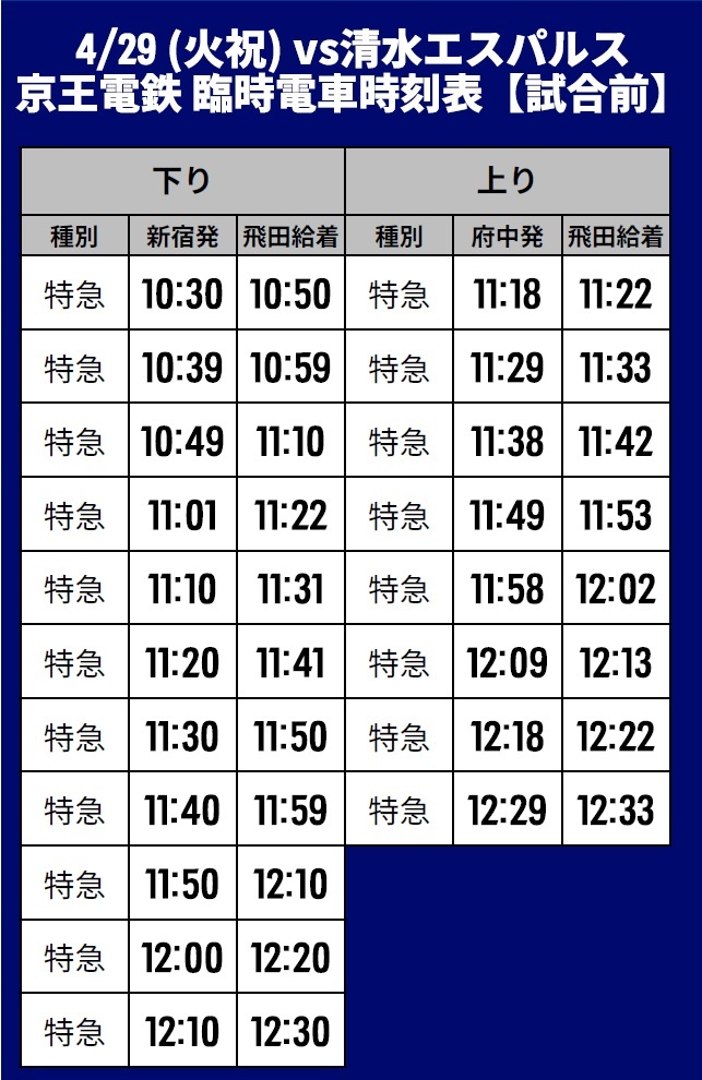 Sa., 29.04. (Feiertag) 2025 Meiji Yasuda J1 League 13. Spieltag vs Shimizu S-Pulse (Anpfiff 13:05 / Ajinomoto Stadium) Informationen zum eingesetzten Sonderverkehr (Bahn), Shuttlebus- und Linienbusverkehr.