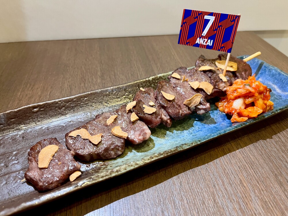 Ein Jumbo-Steak-Spieß mit über 100 g saftigem, aber leichtem Harami (Sagari). Gegrillt mit Soma ANZAIs Lieblings-Knoblauchbutter und zusätzlich mit Knoblauchchips bestreut, ist dies ein kraftvoller Spieß.