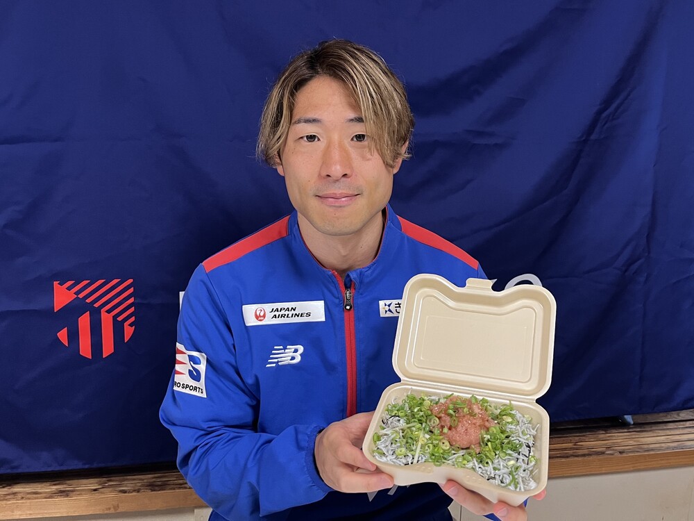 Knusprig gebratene Hähnchenstücke mit einem milden Sojasaucengeschmack und Knoblaucharoma, kombiniert mit der berühmten Mentaiko (Würzige Kabeljaumilch) aus der Heimat von Spieler Higashi, Fukuoka. Durch die reichhaltige Mentaiko-Sauce entsteht ein Gericht, bei dem man nicht aufhören kann, Reis zu essen!