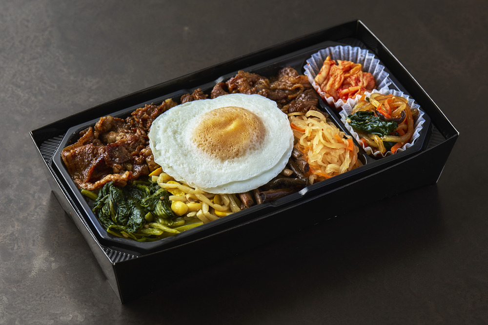 Ein Bibimbap-Box, das die Faszination der koreanischen Küche vereint: dünn geschnittenes Rindfleisch-Kalbi-Yakiniku kombiniert mit Chapchae, einem Lieblingsgericht von Min Gyu JANG, Chinakohl-Kimchi und farbenfrohen Namul.
