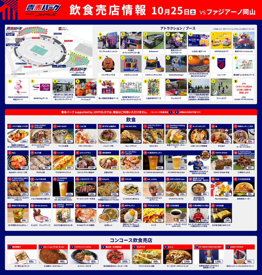 Am Sa., 25.10.2025, im Rahmen des 35. Spieltags der Meiji Yasuda J1 League gegen Fagiano Okayama (Anpfiff 14:00 im Ajinomoto Stadium) informieren wir Sie über die Speise- und Getränkestände im AO-AKA PARK supported by JOYPOLIS (außerhalb des Stadions), den Außeneinsatz des AO-AKA PARK supported by JOYPOLIS sowie die Verkaufsstände im Concourse (Innenbereich) des Stadions.
